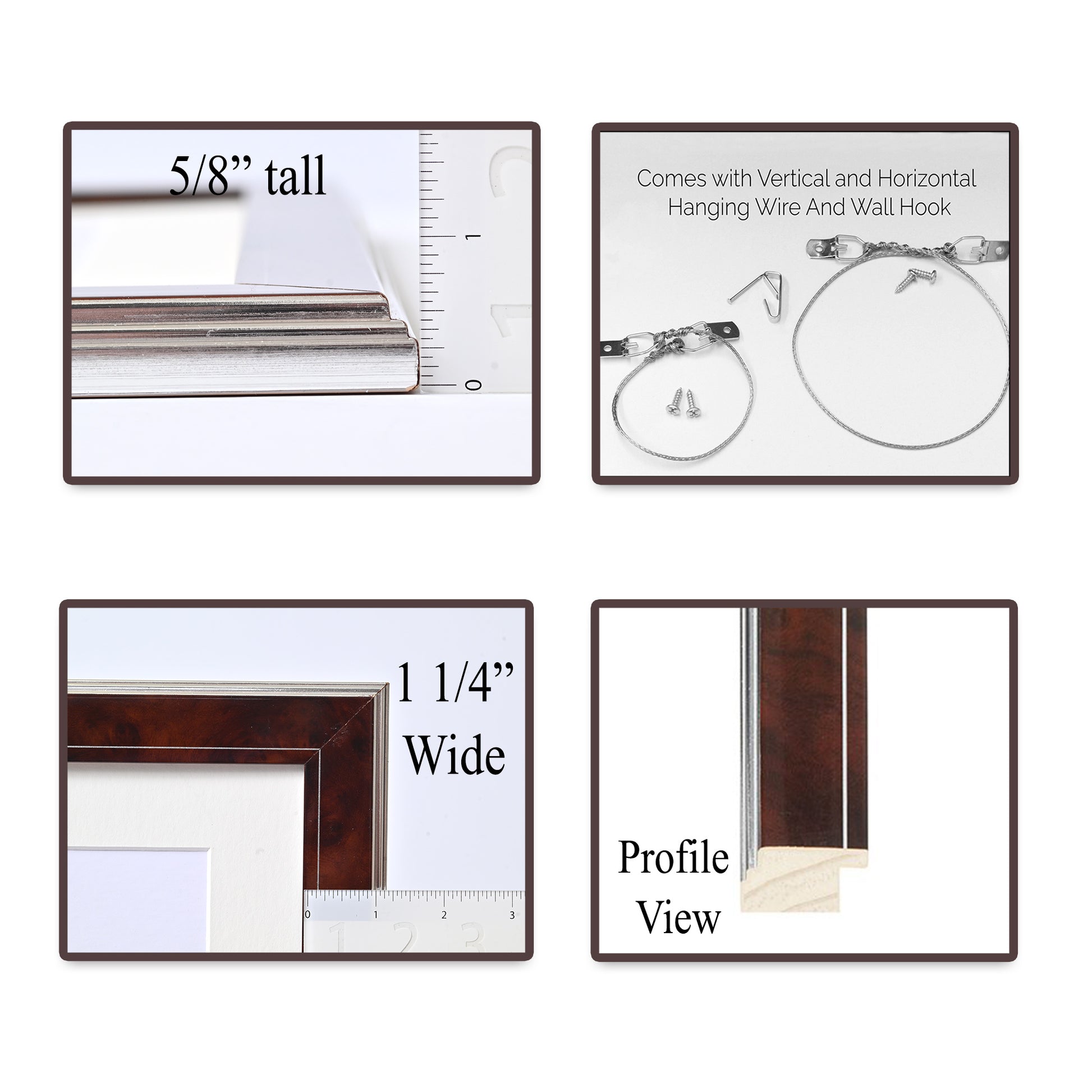 With pre-drilled screw holes and pre-made hanging wires for both vertical and horizontal orientations, its easy to hang up your new frame. All you need to install the hanging wire is a screwdriver! Each frame also comes with an included wall hook for easy hanging.