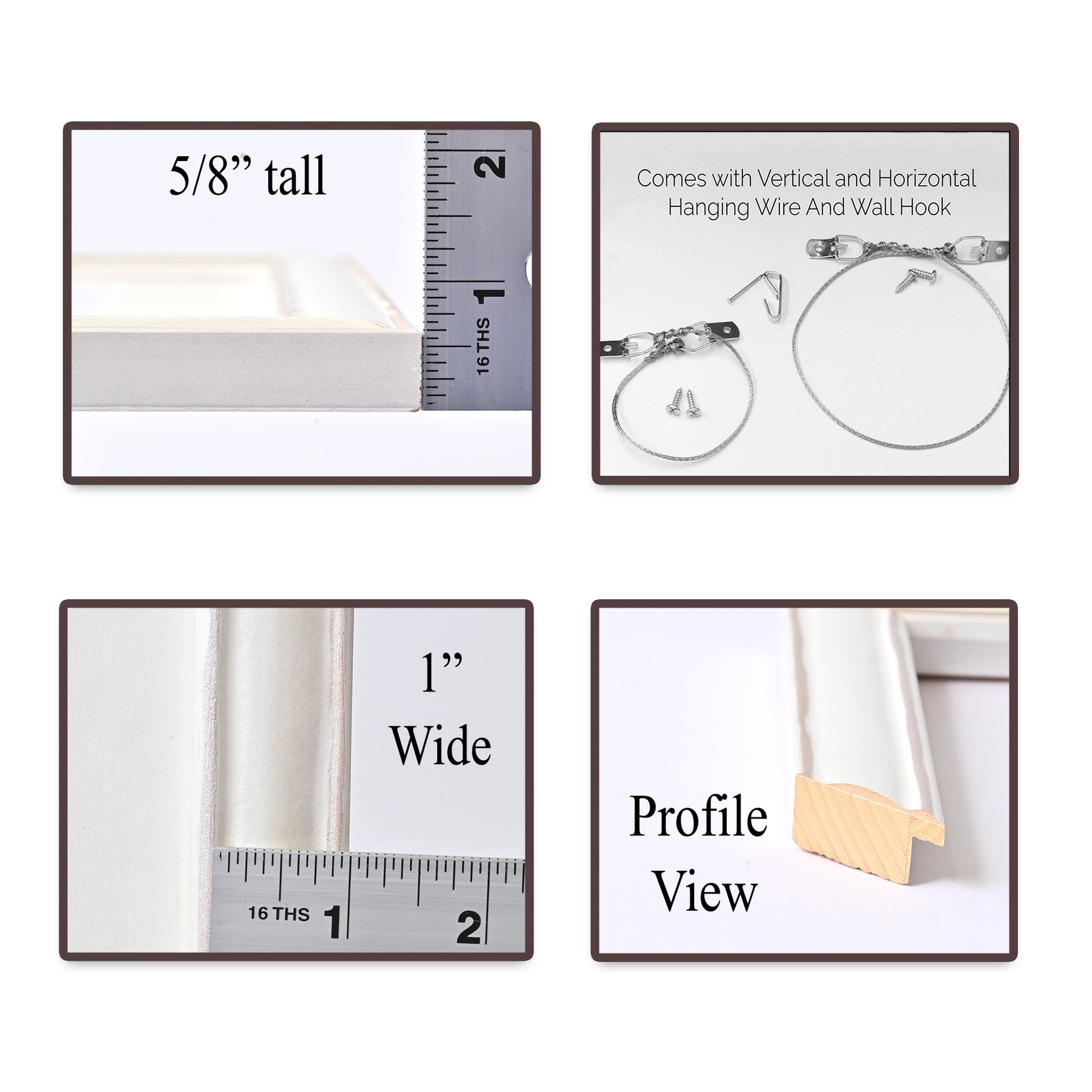 With pre-drilled screw holes and pre-made hanging wires for both vertical and horizontal orientations, its easy to hang up your new frame. All you need to install the hanging wire is a screwdriver! Each frame also comes with an included wall hook for easy hanging.